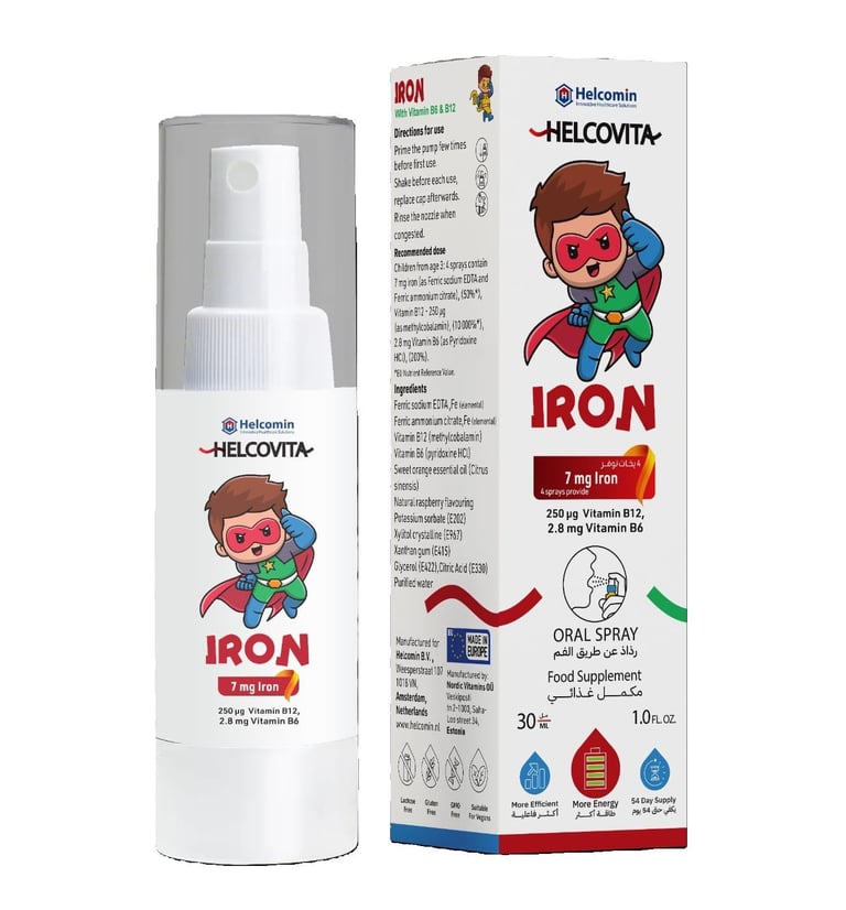 Children from age of 3 years: 4 sprays contain 7 mg iron (as Ferric sodium EDTA and Ferric ammonium citrate), (50%*), 250 μg Vitamin B12 (as methylcobalamin), (10 000%*), 2.8 mg Vitamin B6 (as Pyridoxine HCl), (200%).