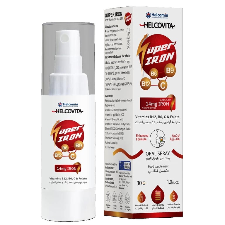 Helcovita Super Iron Oral Spray is your ultimate solution for essential vitamins and iron delivery. This powerful spray includes a vital blend of B12, B6, Vitamin C, and Folic Acid, ensuring you get the nutrients you need in the most efficient way possible. Each 3 sprays delivers 14mg of easily absorbable iron, designed to maximize its effectiveness and boost your daily energy. Convenient and easy to use, Helcovita Super Iron Oral Spray redefines your supplement experience. Available in a sleek, portable spray bottle—perfect for an on-the-go lifestyle. Elevate your health regimen with the convenience and potency of Helcovita Super Iron Oral Spray today.